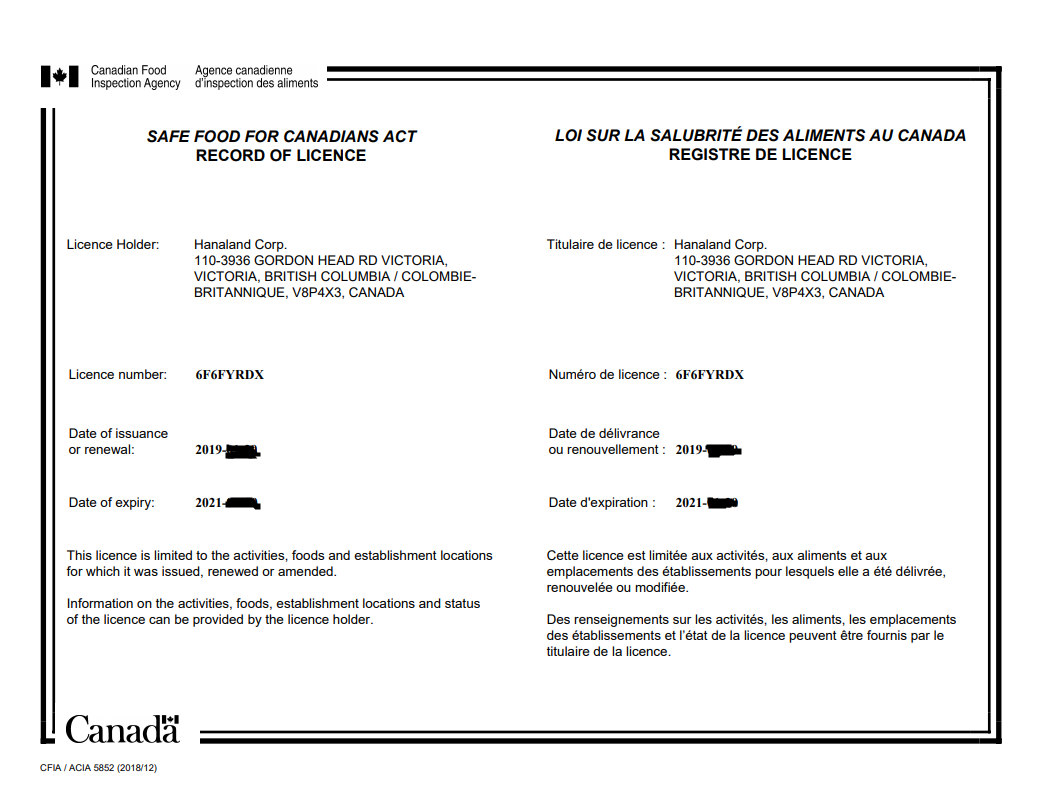 SFCR(Safe Food for Canadians Regulations) Food Licence 2019년 1월 15일 개정된 캐나다 식품수입허가서를 취득   CFIA (Canada Food Inspection Agency) 에서는 2019년 1월 15일 부터 새로운 규정을 시행합니다. SFCR (Safe Food for Canadians Regulations) 라는 캐나다 식품안전규정입니다. 예전 수산물 수입을 위해 발행했던 Fish Import Licence 가 올해 1월 15일 부터 SFCR로 개정된 것입니다. Hanaland Corp은 [...]
